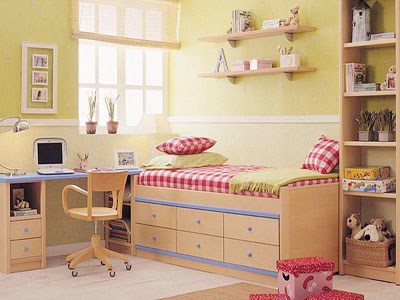 為保證有一個盡可能大的游戲區(qū),家具不宜過多,應(yīng)以床鋪、桌椅及貯藏玩具、衣物的櫥柜為限。