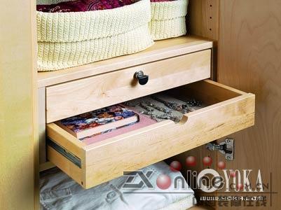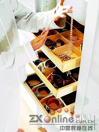 在衣帽間中設(shè)計一組獨(dú)立的抽屜,用來存放那些經(jīng)常要用或者自己喜歡的物品。如果設(shè)計時沒有這樣的地方,后來再配一個獨(dú)立的小推車也能起到同樣功效。當(dāng)你步入這個空間,迎面而來的這個可愛的小柜,將令你感到多么的貼心和愜意! 上海裝潢網(wǎng)