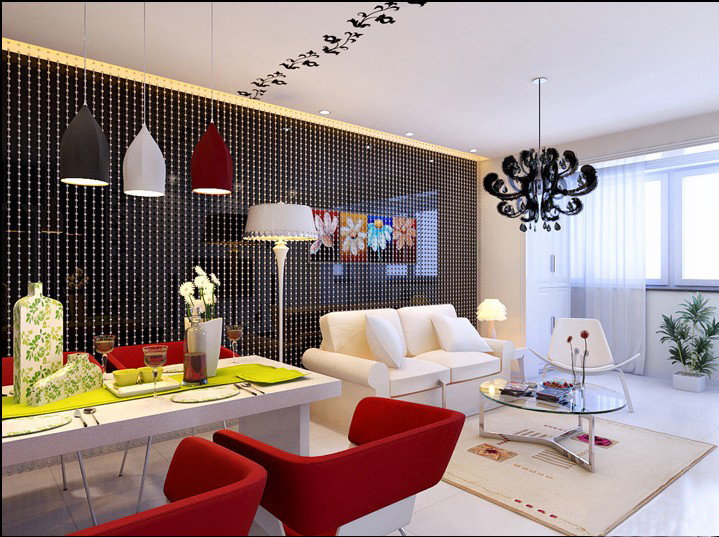由于空間有限的緣故,客廳和餐廳自然是合二為一的。客廳是家中最主要的活動區(qū)域,它應(yīng)該寬敞、方便。利用大量的烤漆玻璃和白色的家具,讓整個空間在視覺圣桑變得實際上大很多。背景墻采用深色系,同白色相呼應(yīng),空間也得到拉升的效果。