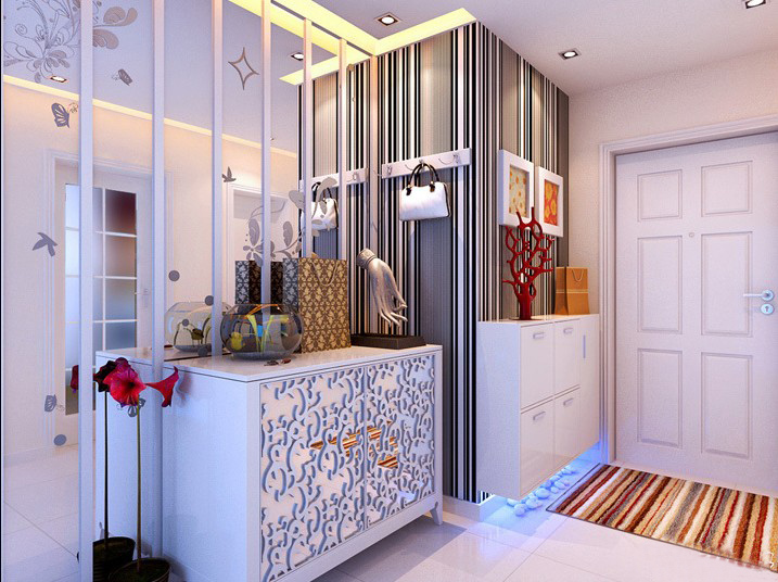 最后看一下玄關(guān)。門廳的基本功能就是放置鞋子和掛衣物,入戶門側(cè)是翻板式的鞋柜,在拐角處放置了一排掛鉤,客廳門前右邊的墻上用了處花紋銀鏡配以木條裝飾,在保證了空間的延伸感同時不至于眩目。在裝飾銀鏡前放置一組漂亮的裝飾柜,保證了空間合理的利用。