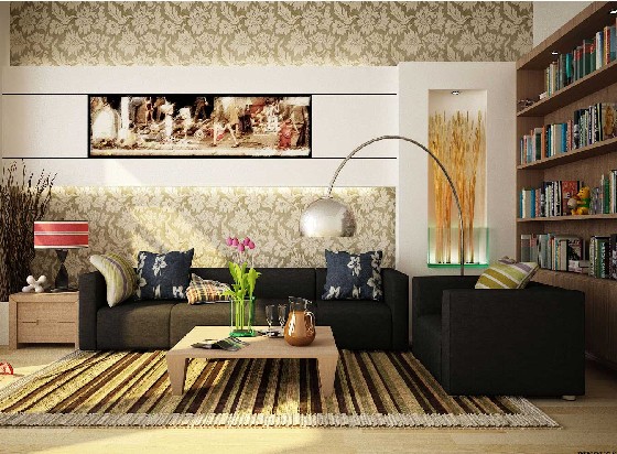 客廳中視聽主題墻比較多見。由于它地處客廳的中心位置,因此也較容易成為人們視覺的聚焦點,視聽主題墻的設(shè)計應(yīng)在其空間功能的基礎(chǔ)上,根據(jù)其空白面積的多少進行構(gòu)思。材料的使用可以是無限制的,但應(yīng)體現(xiàn)主人的個性,并把其獨特的品位引入其中。由于視覺的特殊功能,因此在視聽設(shè)備的正后面,選擇吸音的材料會更好地體現(xiàn)它的功能性,如吸音好的地板、文理粗糙的壁紙、有肌理效果的石材或故意作出的粗糙墻面等。另外,運用這樣的材質(zhì),還能在墻面上拼貼出異乎尋常的畫面效果,形成綜合的視覺回饋。但視聽主題墻的設(shè)計要特別注意嚴整,避免零亂;其次色彩和材質(zhì)在保持新穎別致的同時,也要注意不與整體的客廳環(huán)境相矛盾,除非你的墻面很小,可以被當作展示個性的角落,否則越大的墻面,就越注意整體的和諧。