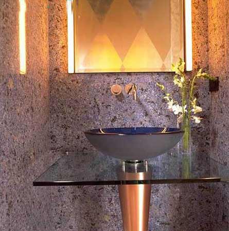 家庭衛(wèi)生間大多采用低彩度、高明度的色彩組合來襯托干凈爽快的氣氛,因此衛(wèi)生間的整體燈光不必過于充足,只要有幾處重點(diǎn)即可。