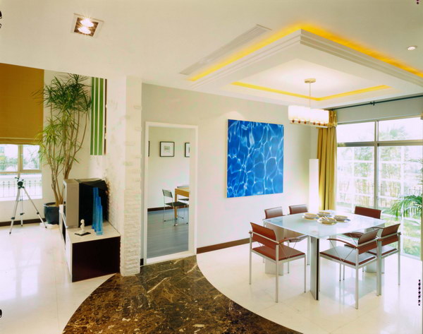 利用裝修手法區(qū)分:各個功能性分區(qū)都有它的主要功能,您可以利用獨特的裝修手法來區(qū)分它們。這種區(qū)分主要在吊頂上,如在整個大廳中可以做兩個局部的吊頂,在會客區(qū)上方安置一個吊頂,在餐廳上方再安排一個吊頂,這樣就自然形成了兩個區(qū)域。另外,還可以利用墻壁裝飾來區(qū)分空間。如在會客區(qū)中,視聽設備后的“文化石背景墻”就與餐廳的“固定式餐具柜”形成鮮明對比。
