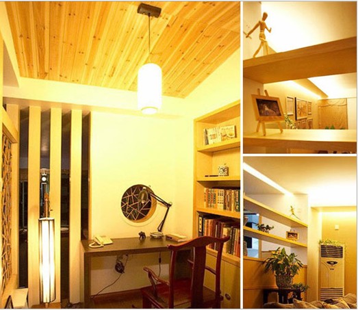 書房,運(yùn)用了暖洋洋的土黃色。書房和客廳是敞開相連的,隔斷將遮未遮,擴(kuò)大了空間感還能滲出一絲文化香,書桌正對面中式圓形窗,更是多了通透感。