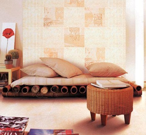 客廳的輪廓以斜插竹桿、磚體屏風劃分,豪華的歐式吊燈與熱情洋溢的“威尼斯春天”系列地磚上下呼應(yīng),真皮沙發(fā)套裝,硬木茶幾,墻面是由墻壁上凹凸混鋪的瓷磚和茶色的反光鏡片巧妙的穿插。整個客廳活潑而不炫亂,更顯現(xiàn)代風尚,無論新朋舊友皆可由衷感受到主人的熱情好客與雍容大方。