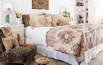 以白色為基調(diào)的臥室,看起來未免有些美中不足。古典花紋的印花織物以及地毯,搭配白色的窗簾和鐵藝床,使整個空間明媚中蘊涵著沉靜的氣息。豹紋沙發(fā)的點綴好似平靜水面上激起的浪花,帶來**與活力。