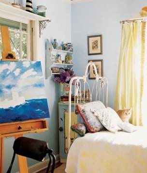 最適合于夏日午后時光流連的舒服小床,簡潔的鐵藝床頭富于美感,手感厚實溫暖的白色床罩和窗簾,搭配淺藍色的墻壁和家具,氣氛寧靜。大小不同的靠墊有很好的裝飾效果。