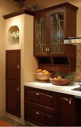 國產的實木櫥柜在處理工藝上比進口櫥柜略差一些,所以大部分都只能做到實木門板,而柜體框架則用防潮性更好的其他材質,以適應中餐廚房。