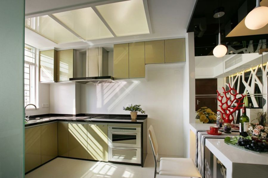 休息與工作,時(shí)間與空間,可更大限度地互補(bǔ)互換,以獲得更大的彈性和自由度,將不同的功能融合在一個(gè)有不明顯界限的空間內(nèi)。廚房間也可以如此舒服。半開(kāi)放式的廚房以餐桌相隔。