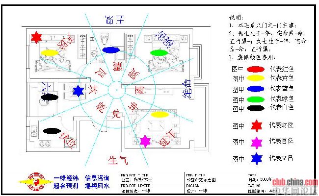 2、藍色橢圓表示此范圍裝修喜用藍色;