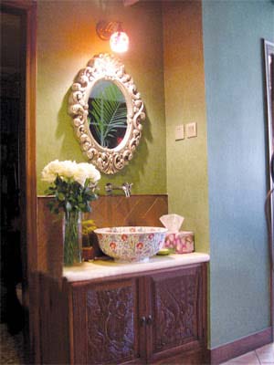 在這個(gè)獨(dú)立的洗手臺(tái)前,洛可可風(fēng)格的銅鏡上方用了一盞小小的花形燈作為鏡前燈,與小花圖案的洗手盆相呼應(yīng)。鏡子反射光線,以此來增強(qiáng)居室的空間感,很大程度上緩解了人對(duì)于狹小空間的恐懼感。并且,柔和的黃色燈光與深綠色的壁紙、深咖啡色的衛(wèi)浴柜搭配在一起,整個(gè)色調(diào)顯得豐富而不突兀,很有藝術(shù)裝飾性。 上海裝潢網(wǎng)