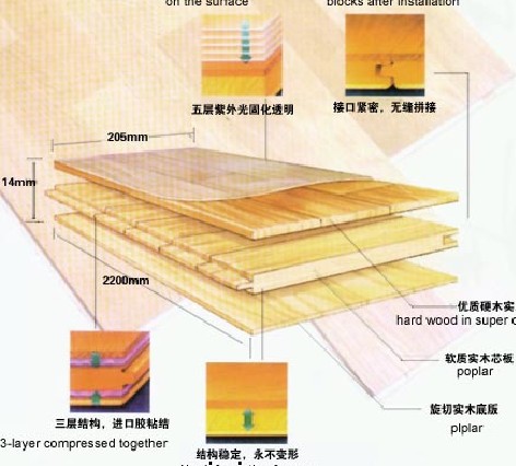 多層實木復(fù)合地板以多層實木膠合板為基材,然后在上面覆貼一定厚度的珍貴木材薄片鑲拼板或刨切單板為面板,再通過合成樹脂膠———脲醛樹脂膠或酚醛樹脂膠熱壓而成,再加工成地板。