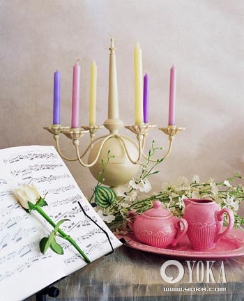 同為圓弧感且同樣低飽和度色彩的燭臺(tái)與茶具,擺放在一起,二者交相呼應(yīng) 。