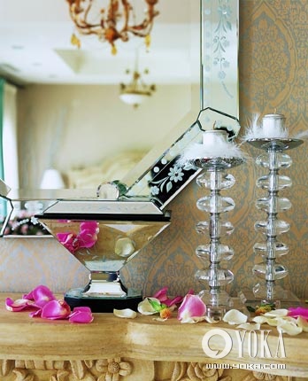 鑲花的鏡子與剔透的燭臺(tái),使整個(gè)居室明亮又靈動(dòng);撒落于角落上的花瓣,將新婚的喜悅氣息娓娓道來(lái)。