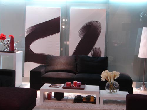 欣賞方案四時,不禁贊嘆設(shè)計者在色彩搭配上的用心。紫色從來都是令人又愛又恨的顏色,大面積使用會讓人產(chǎn)生壓抑感,而小面積使用時,它的獨特個性又讓人在色彩搭配上煩惱不已。此方案為我們提供了一個很好的范例。大面積的明黃色,抹上些許的金黃,點綴幾片深紫,一個華麗而高雅的客廳就這樣設(shè)計出來。