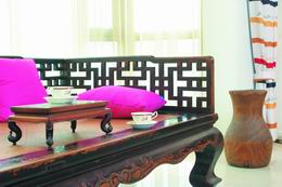 他說:“雖然曾多次搬遷,但所向往及鐘愛的家居風(fēng)格卻始終如一,即是簡潔底色加上古新雜糅的家具搭配,最合我心意?!睂λ?,“家”最重要就是舒適美觀,能夠把自己大量的收藏得體地展示出來。只要懂得布置的手法與竅門,縱使再普通的房子也一樣能令人眼前一亮。所以,家里的裝修不多,白墻、極大塊淺白色的仿石材地磚,簡單大氣。摒棄了繁華夸張的布置,家中的視覺焦點自然而然地落在一室古舊的家具以及風(fēng)格特異的掛畫上。古今融合的客廳,以木色和淡米色為主,一幅幅碩大的畫像襯托在素雅的客廳下,無疑成了廳中的一大特色。放眼望去,客廳中央的淡灰色布沙發(fā),似乎是廳中唯一的新潮家具。相對之下,周遭精致且玩味的收藏品卻布滿了整屋子,文化的味道就這樣淡淡發(fā)散,耐人尋味。