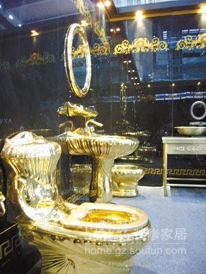 記者發(fā)現(xiàn),這套包括一只馬桶、一個(gè)洗手臺(tái)和一面鏡子的金光閃閃的廁具,看不出有什么特別之處。但細(xì)細(xì)一看,你會(huì)發(fā)現(xiàn)它的表面均是以18K金燒制而成的馬桶確實(shí)讓人驚異。據(jù)介紹,加上化妝鏡和盥洗設(shè)備這套金光閃閃的廁具總共需要180萬元。