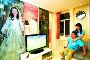 客廳電視墻里展示著主人的結(jié)婚禮服,滑動(dòng)門上是兩個(gè)人復(fù)古宮廷裝的婚紗照。