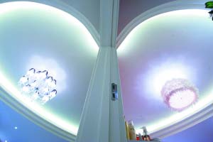 臥室和客廳兩個(gè)空間的天花板上,分別有一半心形的造型,組合在一起就是一個(gè)完整的“心”,將浪漫一直延續(xù)到了天花板上。睡在床上,躺在沙發(fā)上,只要一抬頭,就能感受到濃濃的愛(ài)意。