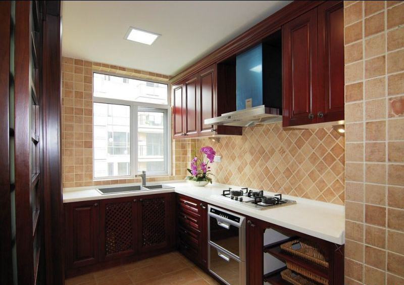 中式裝修的廚房,墻面磚是歐式風格的,櫥柜確依然古色古香。