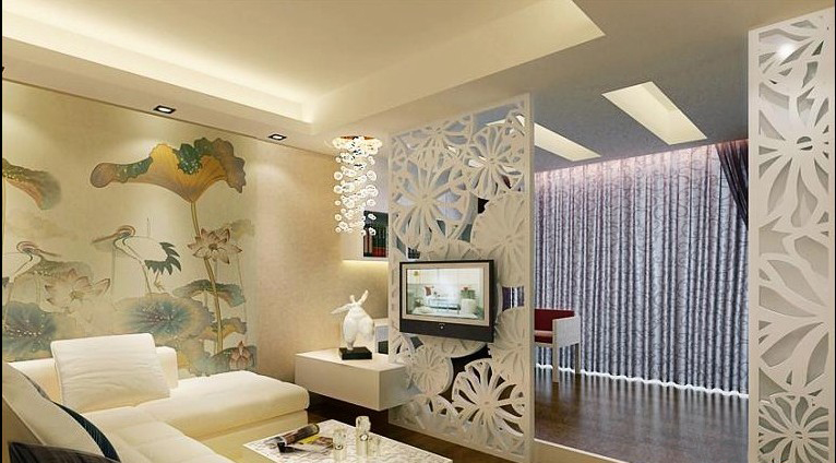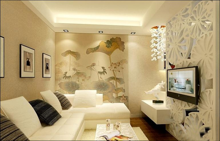 客廳的一側(cè)墻上大幅的落地荷花壁畫,是這個空間的亮點。顯得整個空間清幽雅致