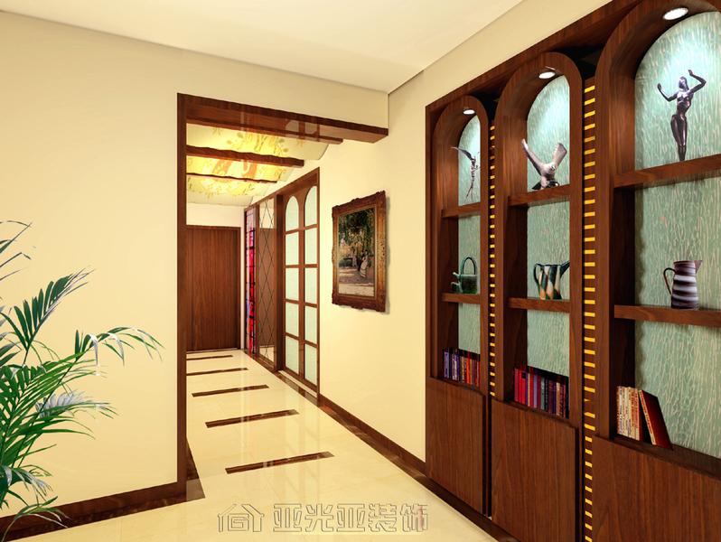 諾伯修茲在《實存,空間的建筑》一書中指出:“空間的概念并不具單一性。除了產(chǎn)生具體活動的空間以外,尚有瞬間取向的知覺空間、具穩(wěn)定意象的生存空間、物理世界的認(rèn)知空間、藝術(shù)空間、單純邏輯的抽象空間以及美學(xué)空間?!?nbsp;光與影在空間情境的塑造上是不可或缺的應(yīng)用元素之一。白天因日照時間的流動而產(chǎn)生漫射入室的光、影,隨著自然的軌跡變化:在夜間,利用人工光源的交替、轉(zhuǎn)換,而產(chǎn)生不同的光影情境,成為設(shè)計本案的精神。 由于房間本身足夠的使用面積與合理的布局,因此無須在空間結(jié)構(gòu)上大玩蒙太奇、解構(gòu)、整合這些常見手法在這里都難覓其蹤。只是將書房與客廳、過道之間的隔斷拆改為玻璃材質(zhì),這樣使書房與客廳、過道之間有連慣性,而且空間上也顯得更加通透。在這里,設(shè)計師同時運用色彩和不同的材質(zhì),如冰山玻璃、軟木材料來豐富空間的層次和變化,仿佛不經(jīng)意間選擇的帶有紋理的軟木,便使純粹的直線架構(gòu)起的空間自然地避免了走向極端的線的僵局。在燈光方面運用射燈、落地?zé)?、吊燈等不同形式的燈光,來烘托和體現(xiàn)不同空間、不同材質(zhì)的變化,在色調(diào)方面,同樣主要以暖色調(diào)為主,追求的是整體的和諧統(tǒng)一。玻璃看似與暖色主題相沖突,但也帶來了產(chǎn)生變化的機遇,好象向我們闡述了主人的一種處事哲學(xué)。