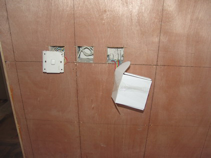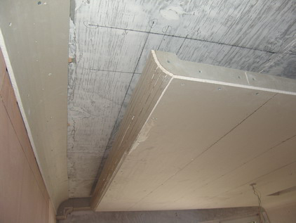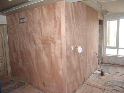 這是玄關(guān)至餐廳的拐角處,由于今后要鋪設(shè)烤漆玻璃,所以,木工師傅采用了大塊木板做基層,確保了其牢固度。我們?cè)谒谢鶎拥闹谱魃弦欢ㄊ橇η蟀踩?、到位?/P>