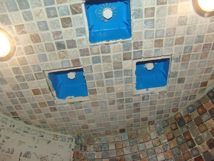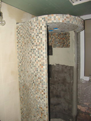 沐浴房安裝的嵌入式花灑是在鋪貼馬賽克之后,師傅們?cè)阡佡N工作中細(xì)致地劃分區(qū)域預(yù)留位置。
