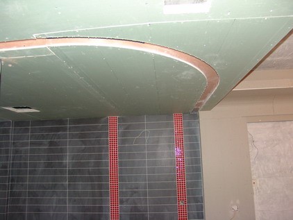 流暢的圓弧是師傅們將石膏板裁成好多細(xì)長(zhǎng)條拼成的,頂面還做了精確的彈線定位,這不僅需要技術(shù),還需要師傅們極大的耐心。