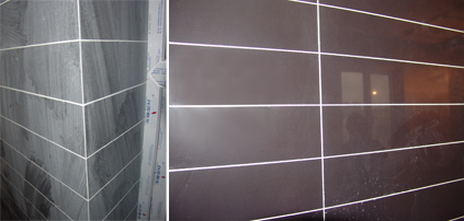 縱橫有致的瓷磚鋪貼其實(shí)也十分講究,這光滑的邊角和整體的平面效果不是輕易貼出來的,所有直角對(duì)拼邊緣部分都經(jīng)過45度的切割,和長(zhǎng)條面磚拼接時(shí)一樣,連接處所有的縫隙都要很均勻地填補(bǔ),這樣看上去才有整體質(zhì)感。