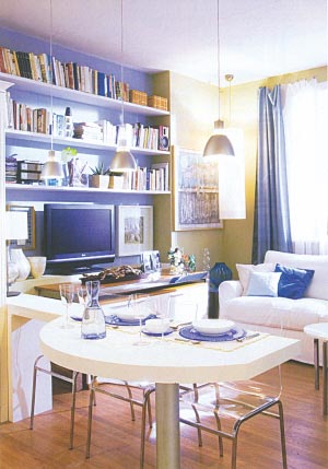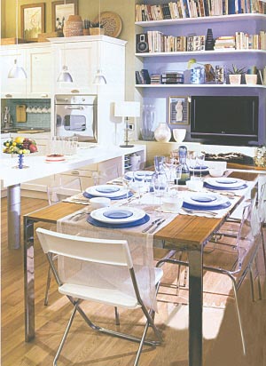 在這35平方米空間里可說是五臟俱全。一張餐桌、六把餐椅,占據(jù)了客廳的所有活動(dòng)空間,但有了可伸縮的餐桌,在不聚餐的時(shí)候,客廳里的活動(dòng)空間可被完整地還原。金屬結(jié)構(gòu)、橡木臺面的餐桌搭配半透明水晶外殼的椅子,布置出簡潔的就餐領(lǐng)地。準(zhǔn)備若干把可折疊的椅子是必要,方便就餐客人人數(shù)的增減。白色的桌布、藍(lán)白兩色的餐具干凈清爽??臻g雖小,與朋友相聚的快樂卻一點(diǎn)都不會減少。