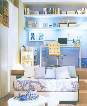 地臺之上,設(shè)計(jì)了一個(gè)藍(lán)色的小書房,緊靠書房的沙發(fā),就是隱藏在地臺內(nèi)部的雙人床。白天,推進(jìn)地臺的雙人床是一個(gè)舒適的沙發(fā),與另一個(gè)白色沙發(fā)以及小茶幾圍合出一個(gè)其樂融融的沙發(fā)區(qū)。到了晚上,收起茶幾,將雙人床拉出地臺,一張舒適的大床躍然眼前。