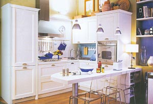 白漆櫥柜令小廚房充滿了明亮印象,人造石臺面與櫥柜渾然一體,品質(zhì)感絲毫不減。在與壁柜相接的空白墻面上,天藍(lán)色玻璃馬賽克令流動(dòng)的視覺產(chǎn)生出美妙的變化。所有的餐廚用具都以藍(lán)色、白色和金屬色為主,統(tǒng)一的色彩使小廚房里沒有任何的雜亂。
