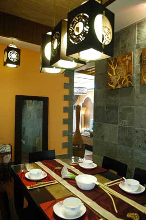 裝飾品的搭配對于風(fēng)格的完整也很重要,設(shè)計師特意挑選了石座人像臺燈、藤球燈、和傳統(tǒng)圖騰裝飾畫。這些都具有明顯的中華民族特征,是本次設(shè)計風(fēng)格的完美點化物。
