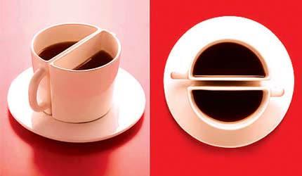 這是一款別出心裁的咖啡杯,它的設(shè)計(jì)非常有創(chuàng)意,設(shè)計(jì)師將一個(gè)圓形咖啡杯“切”成兩個(gè)半圓形再組合在一起。簡約大方的造型與色澤讓人愛不釋手,它既可以分開來單獨(dú)使用,又能夠完美地組合在一起,當(dāng)然用來為情侶們提供香濃美味的咖啡真是再好不過的了