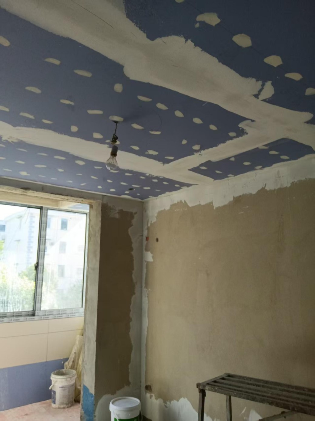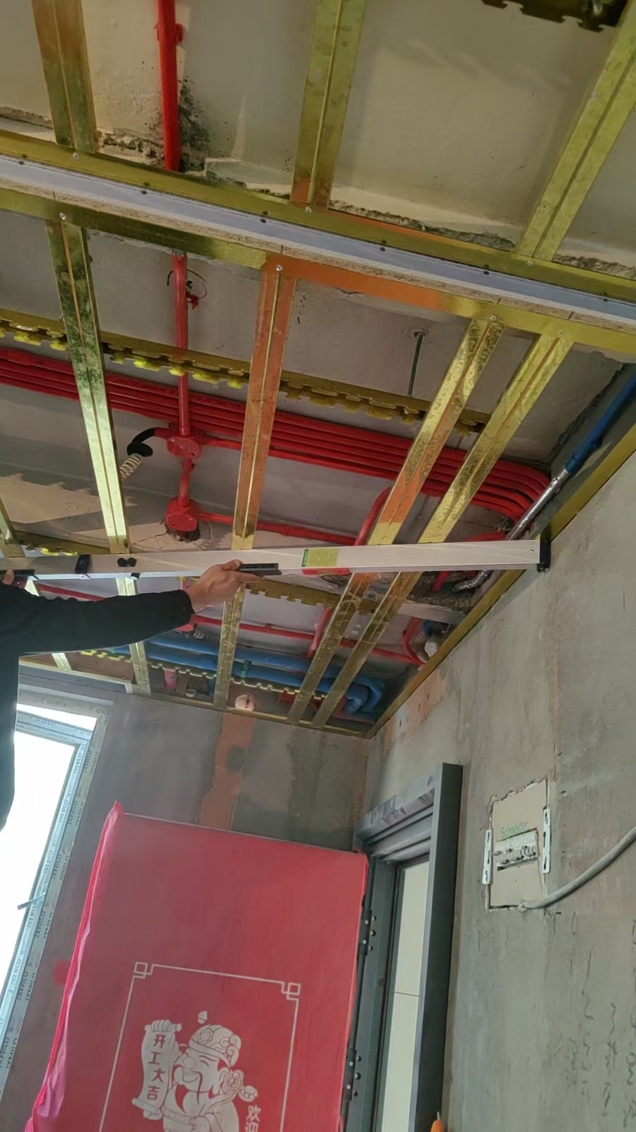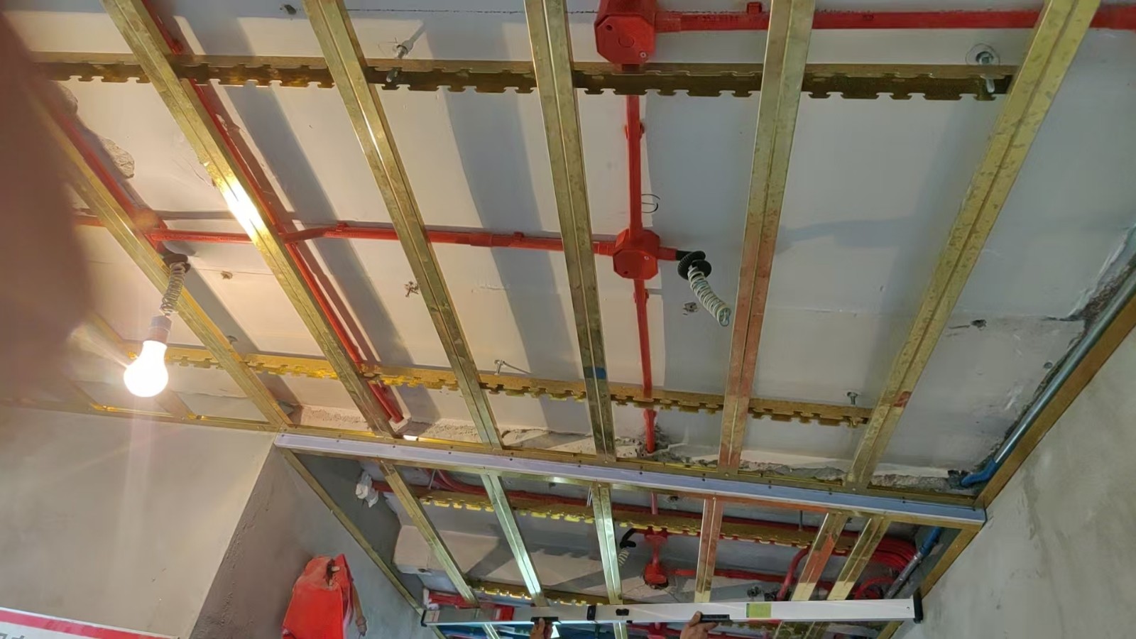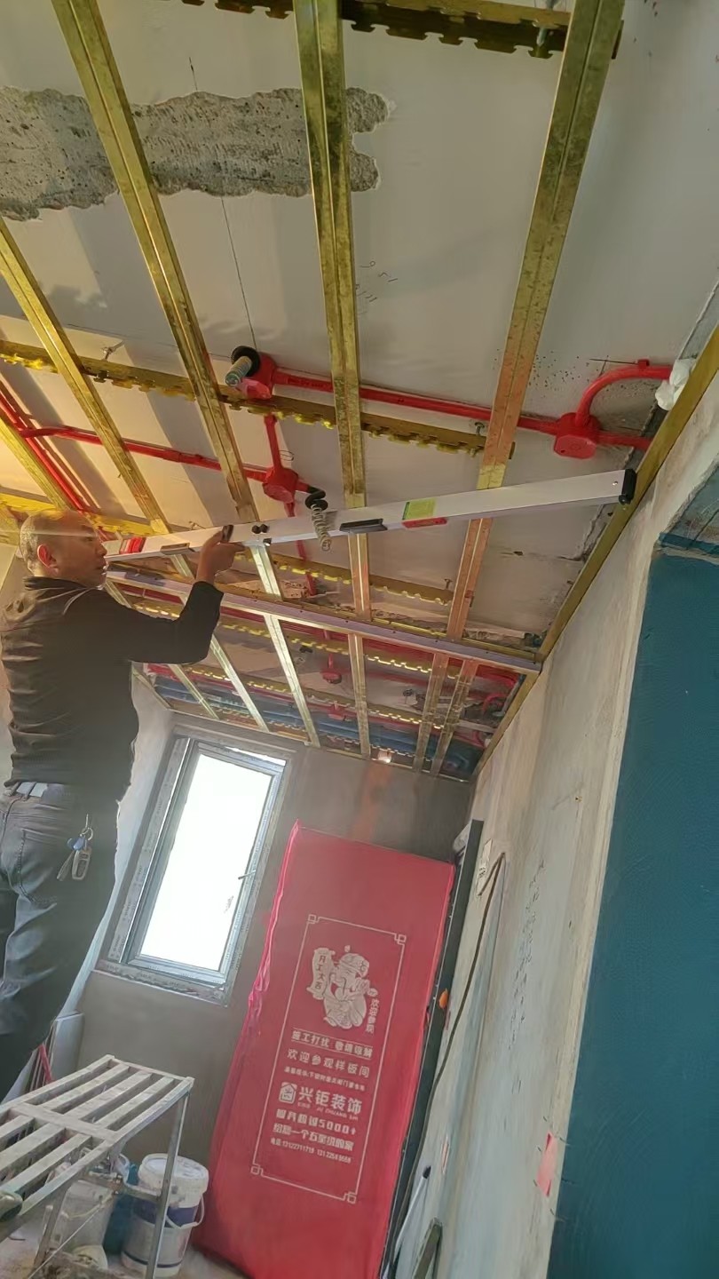 木工階段:龍骨的細節(jié)非常關(guān)鍵, 我們采用的是黃金龍骨 , 從耐用性和硬度來說都是比較好的材料,安裝完后洞口第一時間堵好,防止蚊蟲進入,燈線得留出放好,便于后續(xù)安裝,項目負責人繆工在木工完工后做了內(nèi)部驗收,采用水平儀做了平整度驗收。