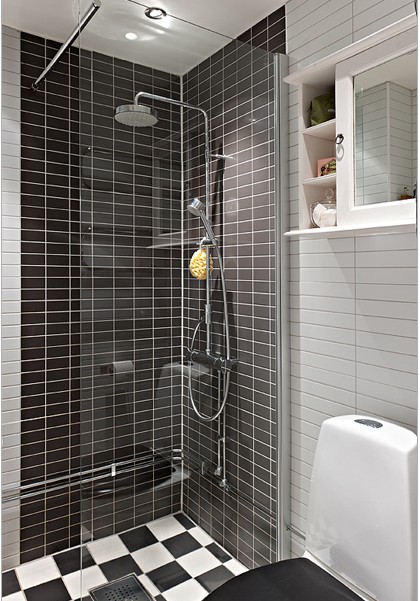 整個衛(wèi)生間的墻身以黑色、白色格子瓷片為主,現(xiàn)代感十足。精心設(shè)計好瓷片的顏色和組合,為座便器、花灑、臺盆等均設(shè)計了不同的背景,使衛(wèi)生間看起來也風景無限。