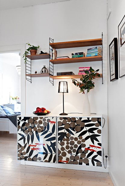 進門處一角的裝飾柜及書架。柜子上的花紋是一大亮點,本不起眼的角落放置這樣別致的柜子會顯得空間飽滿了很多。