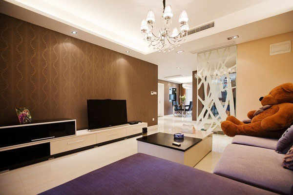 客廳的墻面,窗簾及布藝沙發(fā)以咖啡色及紫色系列。讓充滿現(xiàn)代感的簡約空間里多了一些浪漫溫馨。