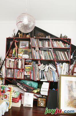 走進(jìn)胡菲家里,還沒等看清楚大概的樣貌,首先就被引入了靠里側(cè)的書房。房間不大,一打開門,迎面就撞見一整面書架。兩個方形交錯疊置的樣子,以及整體黑色油漆底色上,內(nèi)層方形的邊框與隔斷被刷成跳躍的紅色,使它乍看起來好似一個碩大的藝術(shù)裝置,懸掛在正對著門的那面墻上。胡菲和先生都是老師,對書籍的愛好自不待言,而對書架的要求則是希望使它本身就能表現(xiàn)出某種藝術(shù)感覺。因此胡菲自己設(shè)計(jì)了這樣一個特別的樣子,延請工匠師傅來做??梢韵胍姡瑴贤ㄉ匣ㄙM(fèi)了不少力氣,好在她自己能畫圖樣,雖然最后做出來尺寸略有出入,兩個方形并非同等大小,不過對本身便有交錯感覺的書架而言,不對稱亦是一種韻律。等工匠師傅刷好黑色油漆做底之后,胡菲又自己動手,給中央的方形和隔斷刷上紅色油漆。配色的靈感當(dāng)然源自她繪漆畫的感覺,那種手工的痕跡看起來也頗有趣味。