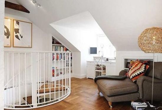 以白色和咖啡色一半一半的比例,讓人登上二層時(shí)有比一層更加寬敞明亮的感覺。利用不規(guī)則屋頂,加大采光的角度,搭配白色墻壁的反射,室內(nèi)光線更加明亮。鳥巢狀的燈罩和咖啡色的沙發(fā)搭配在一起,讓一層和二層的設(shè)計(jì)有所聯(lián)系,這樣整體家居的設(shè)計(jì)主題才能夠統(tǒng)一。同時(shí)二層開始加入紅色的裝修,為下一步的紅色主題做鋪墊。