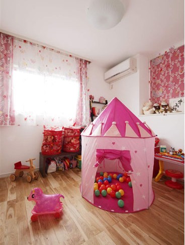 粉色的墻壁打造出柔和輕松的基調(diào)。紅黃色相間的卡通窗簾,很符合孩子們的口味,也讓空間的顏色變得不再單一。因?yàn)榉块g面積有限,角落用隔板改造成開放式的儲物區(qū)域,既不會顯得空間沉悶,也避免了玩具過多帶來的凌亂。房間中央擺放了孩子喜歡的小滑梯,可愛的玩偶,色彩鮮明,童趣十足。