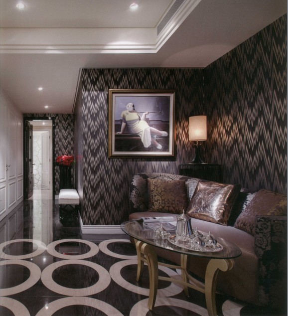 金、銀、白、紫等帶有金屬光澤質(zhì)感的色彩,畫框裱步、編織壁紙、拼花黑檀墻面、銀箔造型電視墻、玻璃馬賽克、貼飾孔雀壁紙……本戶私密空間中,大膽運(yùn)用多元且綺麗的材質(zhì),堪稱“風(fēng)華園”中豪門風(fēng)格的代表作。同時(shí),也將裝飾裝修的藝術(shù)美學(xué),發(fā)展得淋漓盡致,令人震撼而驚艷。