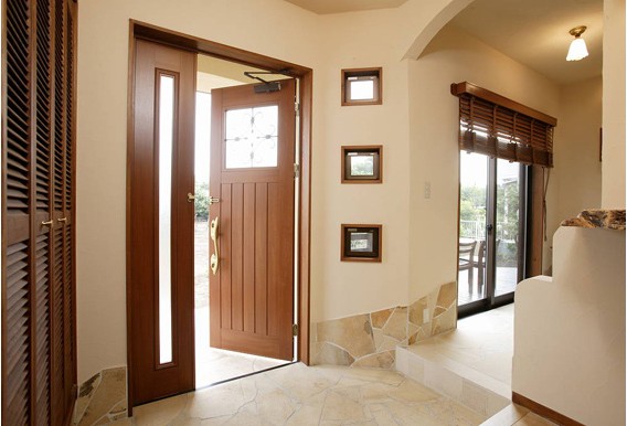 大門側(cè)有三扇玻璃小窗,既可采光通風(fēng),更為入門處增添別致風(fēng)韻。地面裝飾著不規(guī)則的石瓷片,透著淡淡的田園氣息。