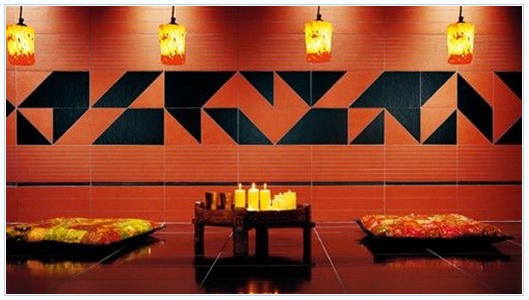 圖中墻面的混搭手法是把長方形的整磚裁切掉一角或兩角,即可形成三角形、梯形、平行四邊形等多種圖案,再把碎磚像七巧板一樣自由組合起來,碎磚的隨意跳躍,加之色彩反差帶來的視覺沖擊力,讓這個多樣混搭的墻面頗有穿上皮衣的那種時尚雍容。這種方法較為煩瑣但并不難,要注意“剪”裁的磚的色彩不要多,避免墻面凌亂無序。