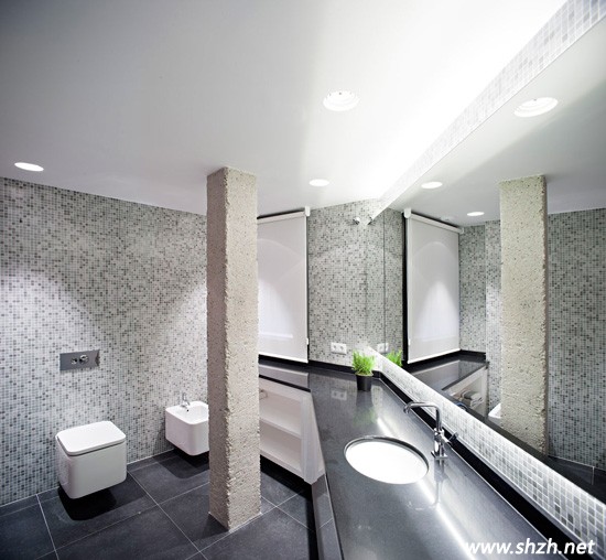 衛(wèi)生間也巧妙的運(yùn)用了水泥柱,將衛(wèi)浴空間干濕分離,而鏡子本身就具有擴(kuò)大室內(nèi)空間的作用。設(shè)計(jì)師在衛(wèi)浴間巧妙的采用了大面積的鏡子,使得小型的衛(wèi)浴視覺上變得更加的寬敞明亮。
