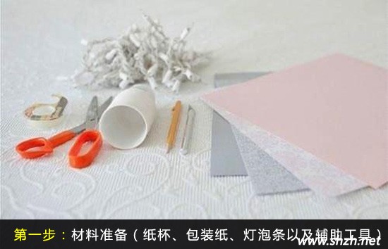 第一步,材料準備。包括:一串彩燈、收集回來的一次性紙杯、各式包裝紙以及鉛筆、剪刀等輔助工具。(注意:包裝紙不適合采用過厚的紙張哦,選取輕薄透光的紙張為宜)