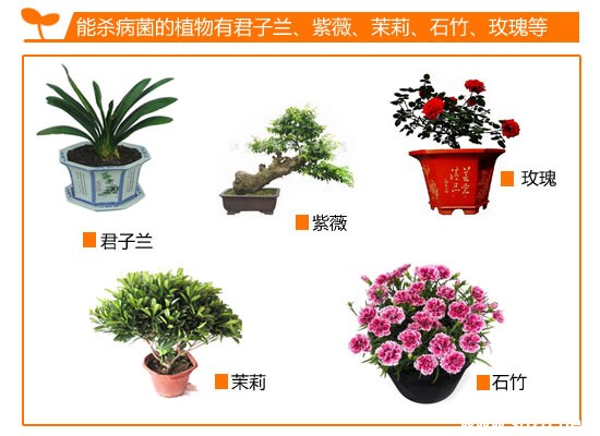 君子蘭、紫薇、茉莉、檸檬等植物,5分鐘內(nèi)就可以殺死白喉菌和痢疾菌等原生菌。薔薇、石竹、鈴蘭、紫羅蘭、玫瑰、桂花等植物散發(fā)的香味對結(jié)核桿菌、肺炎球菌、葡萄球菌的生長繁殖具有明顯的抑制作用。玫瑰、桂花、紫羅蘭、茉莉、檸檬、薔薇、石竹、鈴蘭、紫薇等芳香花卉產(chǎn)生的揮發(fā)性油類具有顯著的殺菌作用。