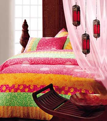 1這款香艷的床品集合了春夏的多種色彩,具有東南亞民族特色的圖案為居室增加了幾分妖嬈的魅惑力。