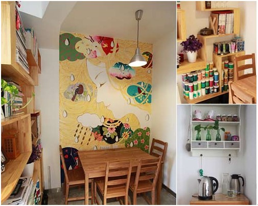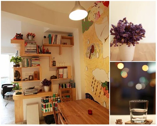 原木色的純實木書架上,錯落有致的擺放著各種各樣書籍與小裝飾品。最下層擺放著手繪必備的各色顏料。生命力旺盛的綠色小盆栽,紫色浪漫的勿忘**花,小清新與浪漫并存。